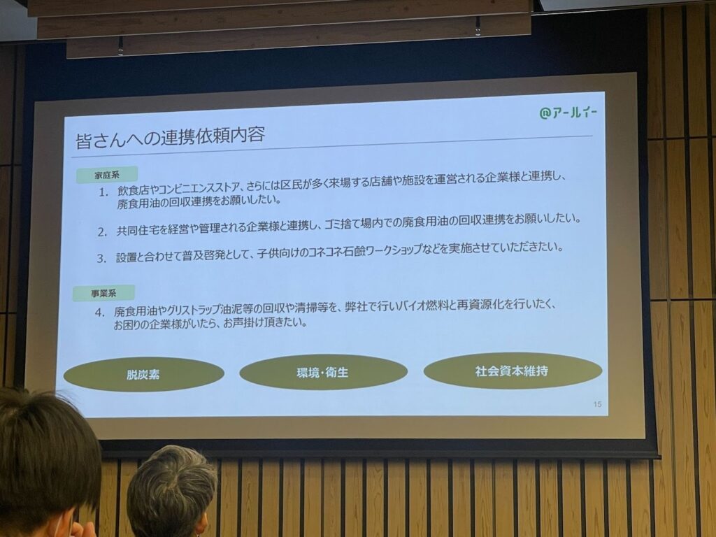 アールイーからは、家庭用・事業用の廃食用油をはじめ、地域で発生する未利用資源を回収・循環させる仕組みや、企業・自治体・地域住民と連携しながら社会実装を進めてきた事例を共有し、都市部における循環型モデルの可能性についてお話ししました。