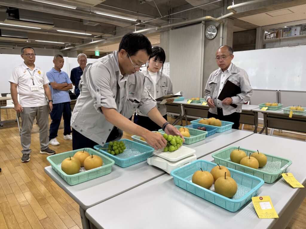 立川市の品評会は、生産者の栽培や選定技術の向上のために行われているものです。果実の外観から大きさや形、色合いなどから熟度などを評価していきます。