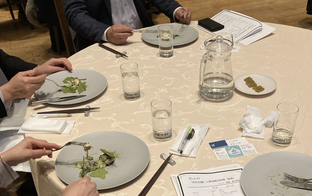 食材に近い場所で料理をする中武氏の料理には、食材をストレートに味わってほしいという思いがこめられているのに対し、熊倉氏の料理は、冬は雪深く食材が手に入りい地域で発酵食材を活用する料理で、全く違ったアプローチで的矢かきを調理していたのが印象的でした。