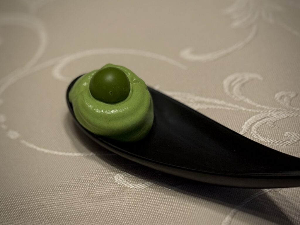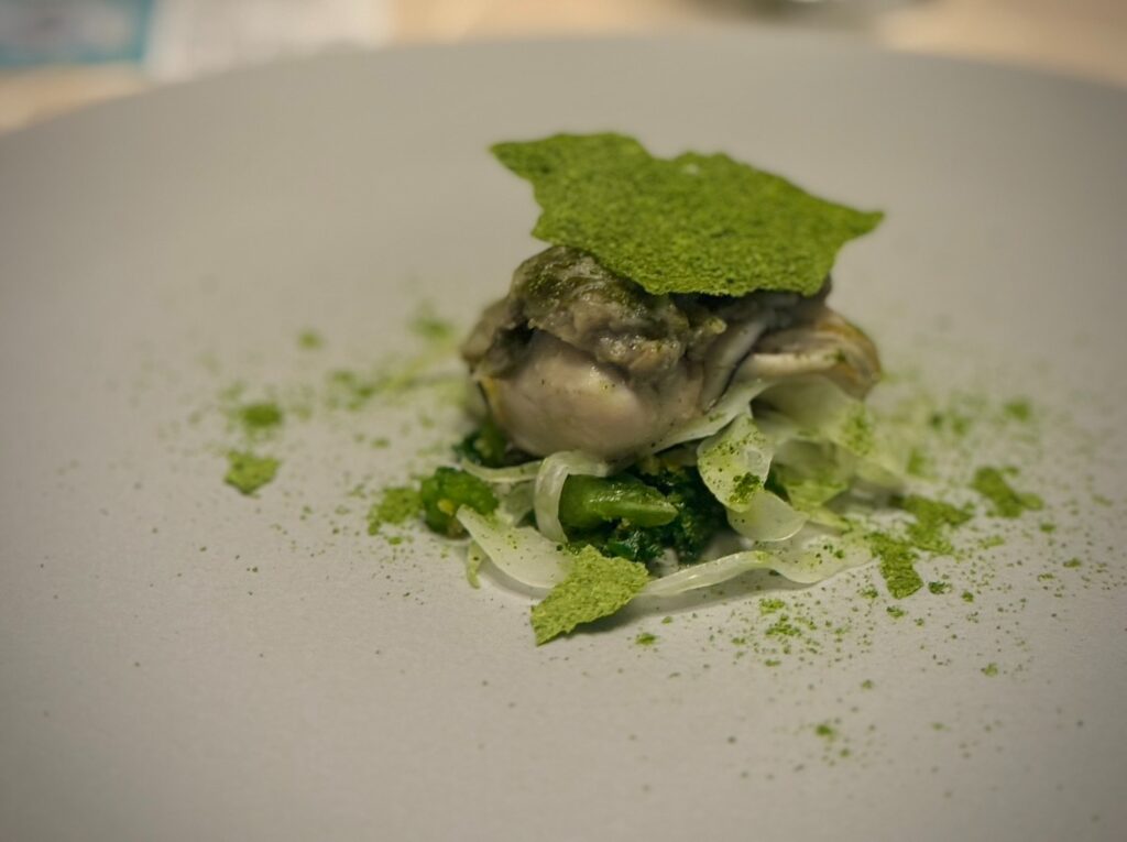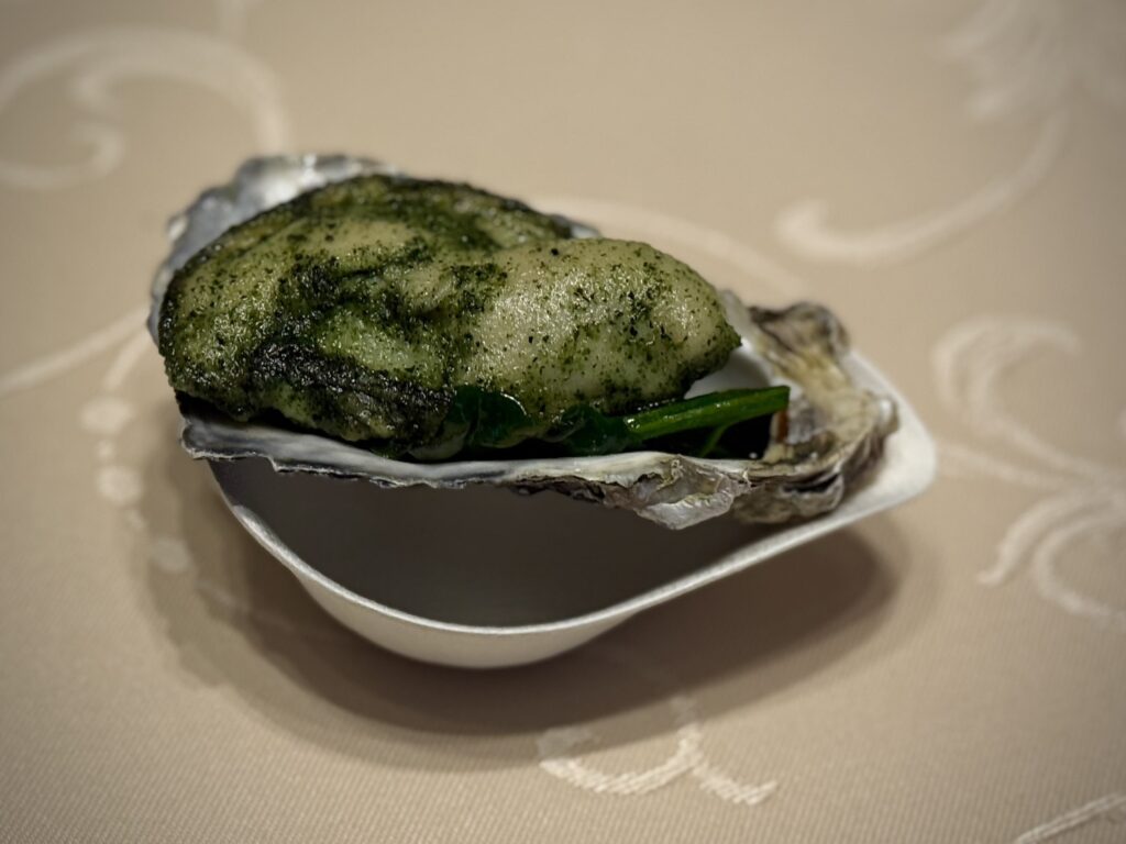 中武さんは、牡蠣に海藻のあおさ海苔から作ったパウダーをまぶしてバターでゆっくりと焼き上げ、豊かな三重県の海を表現します。さらに、県内で採れる日本で開発された野菜「アレッタ」のソテーを合わせて、的矢かきのクリアなうま味にアクセントを加えます。